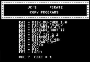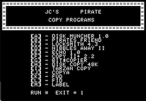 Disk Muncher 1.0, Pirate s Friend, Locksmith 4.3, Nibbles Away II, Echo 1.0, Copy II Plus 2.2, BitCopier, Disk Copy 48K, Tarzan Copy